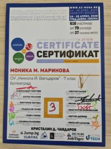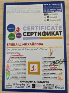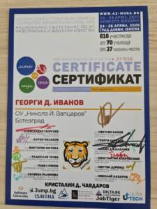 Специални благодарности със сертификат от журито за ръководителя на екипа Георги Иванов (ръководител на направление ИКТ) за постигнатите резултати!