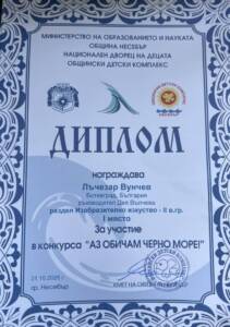 Ученик от ОУ „Н. Й. Вапцаров“ с престижна  награда от XVII Международен конкурс „Аз обичам Черно море“ – 2025 г.